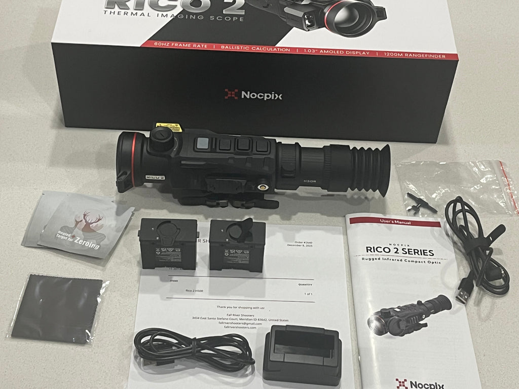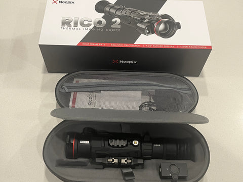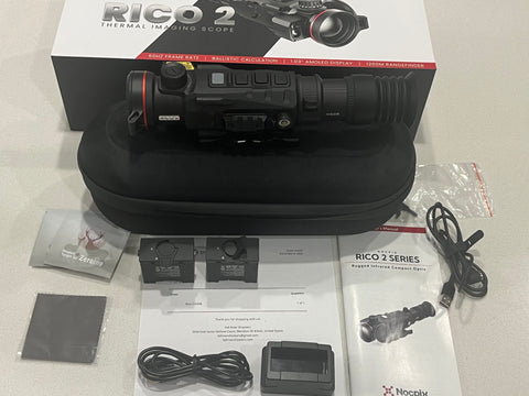 Only 2 months old! This is a like new Nocpix Rico 2 H50R. The customer bought it and a Rico 2 S75R. Then after a month decided he wanted 2 S75Rs and traded this in to upgrade to the same scope but with a 1280 sensor. It comes with original purchase receipt, dated December 8, 2025, and has a warranty through Dec. 8, 2030.